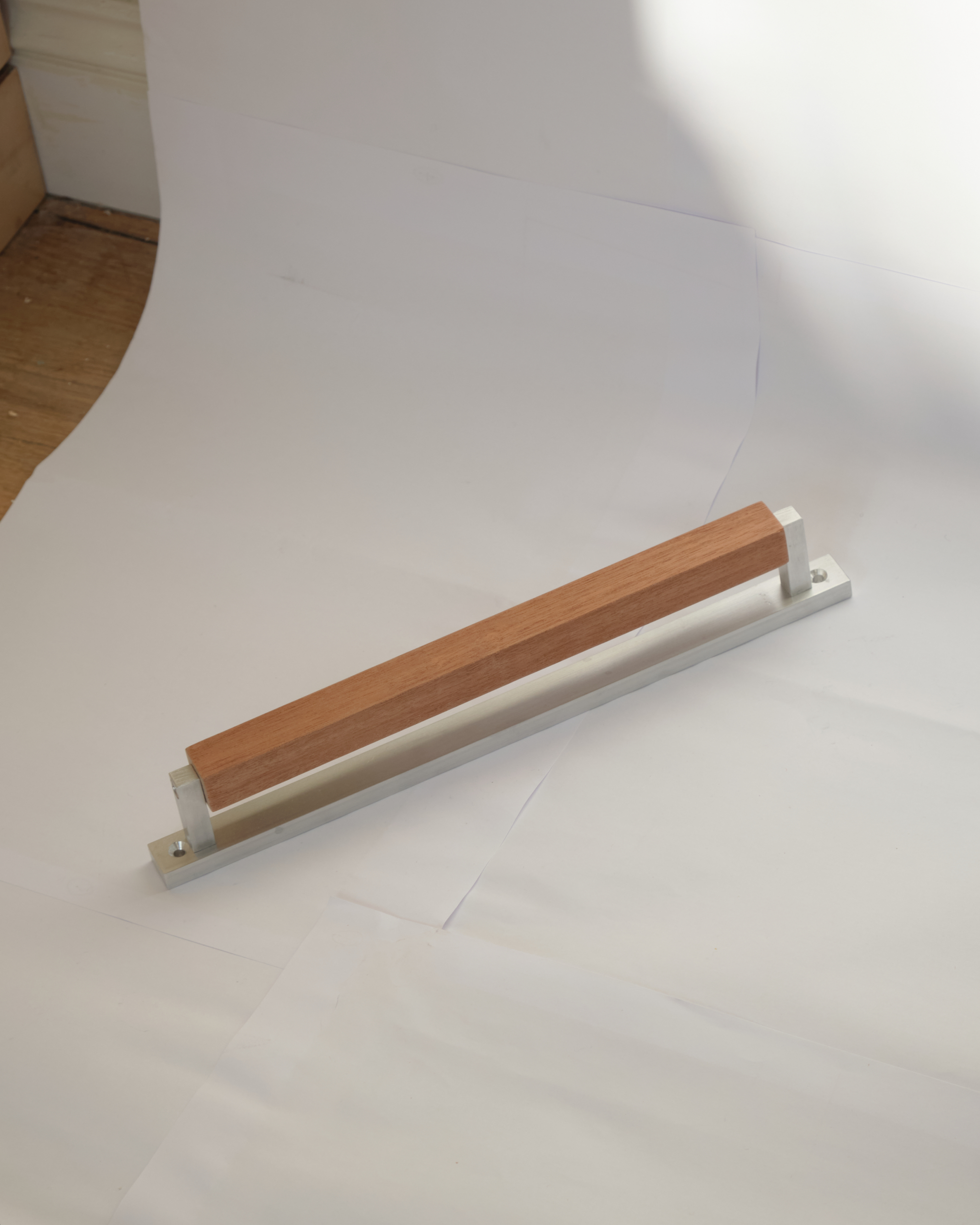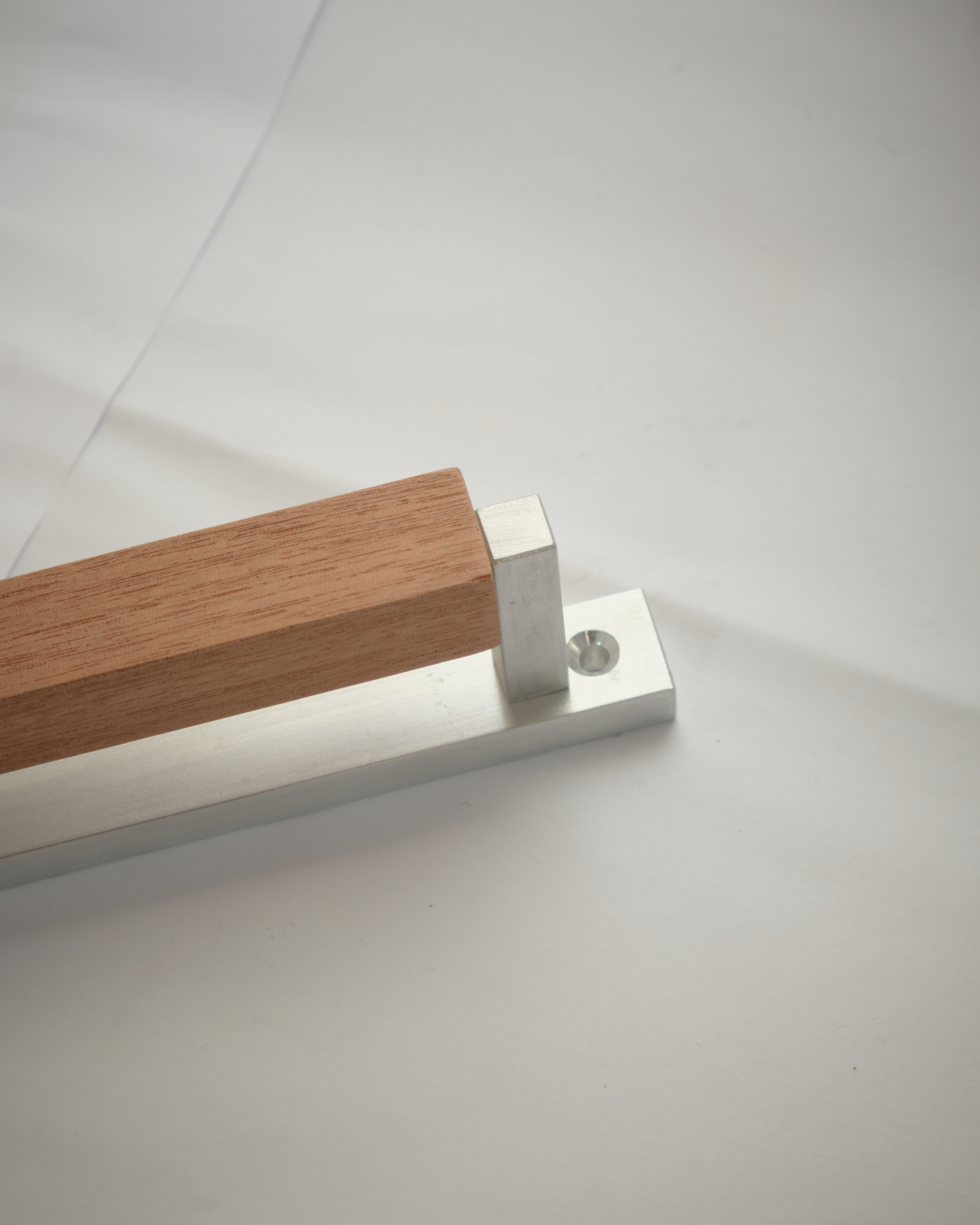 Fabricated from solid aluminium bars and untreated sapele, this cabinet handle by Freddy Tuppen reflects two ideas central to his practice: honest materials and objects that reveal how they are made. The contrast between cold metal and warm timber is made explicit through mechanical fixings, which hold the materials together without concealing the method of assembly.