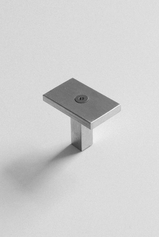 Fabricated from solid aluminium bars, this small cabinet pull by Freddy Tuppen expresses two ideas central to his practice: honest materiality and objects that reveal their construction. The unvarnished metal is brutalist in its starkness, while, in scale and proportion, the form has been sensitively designed to relate to the body.