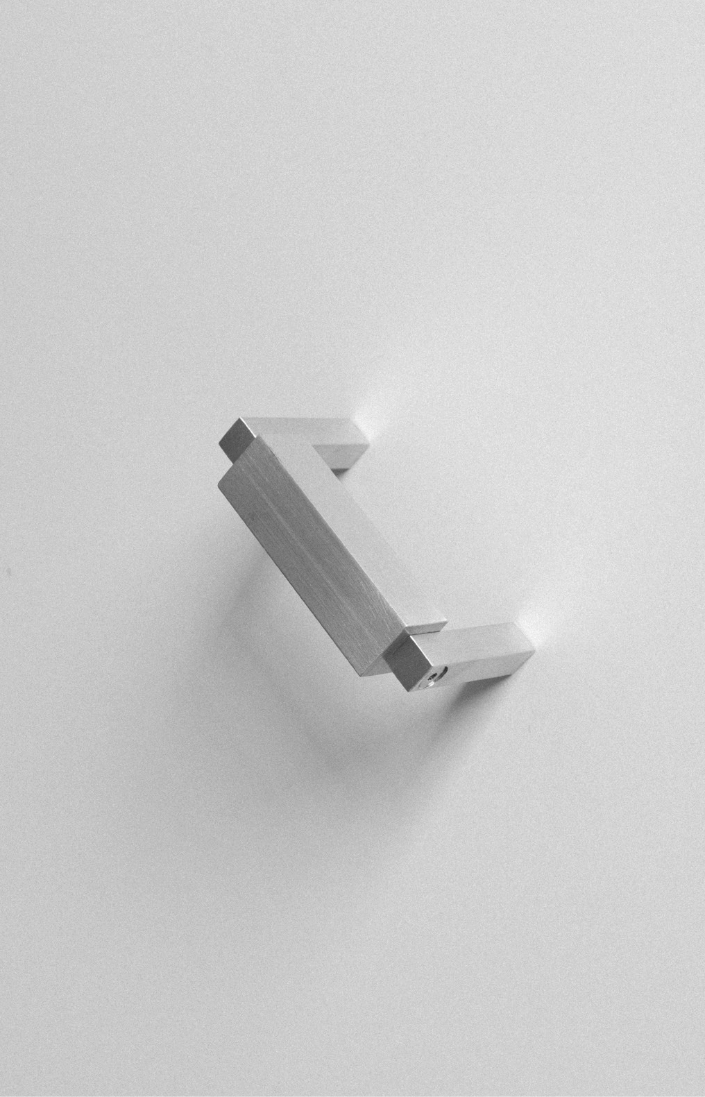 Fabricated from solid aluminium bars, this cabinet handle by Freddy Tuppen expresses two ideas central to his practice: honest materiality and objects that reveal their construction. The unvarnished metal is brutalist in its starkness, while, in scale and proportion, the form has been sensitively designed to relate to the body.