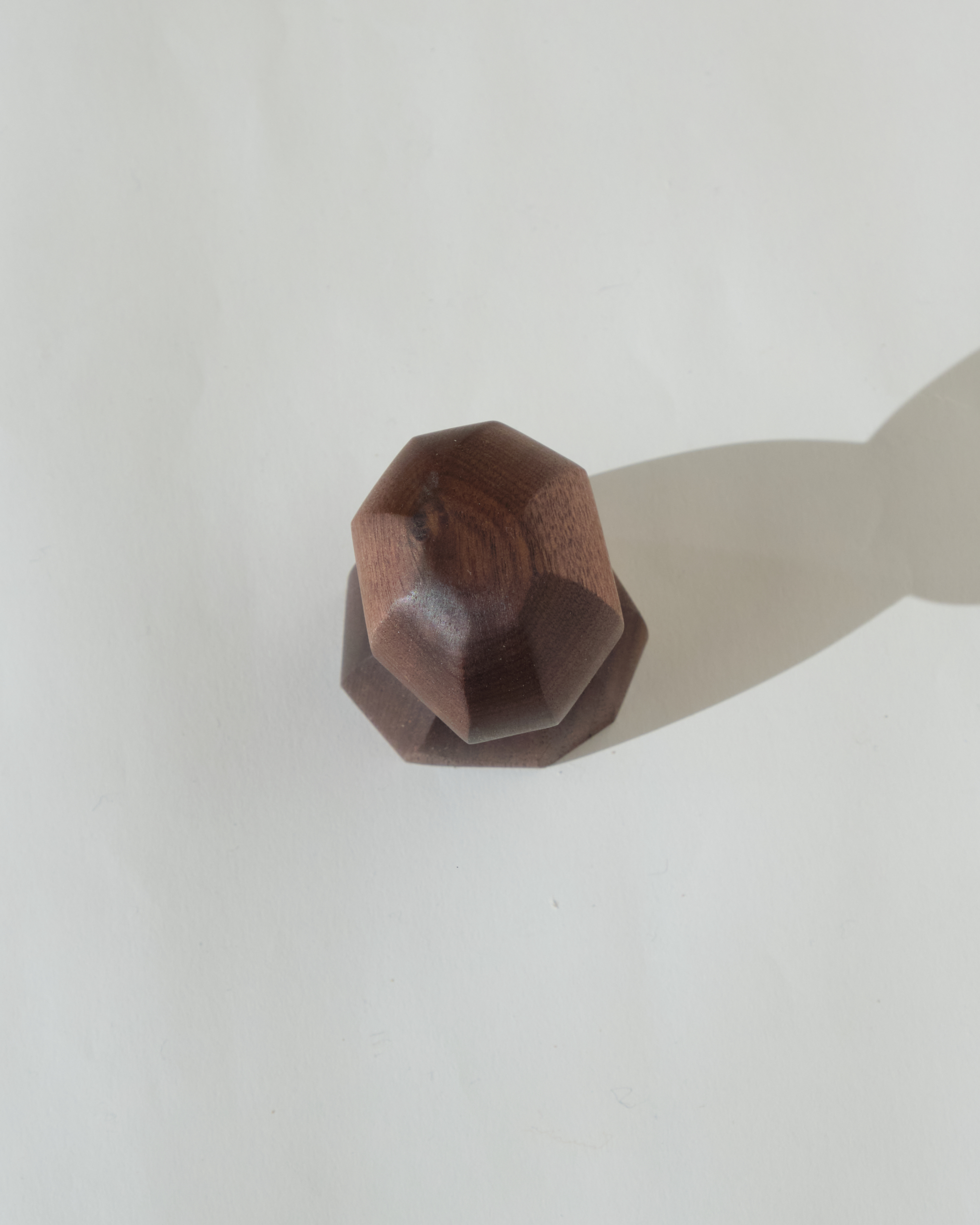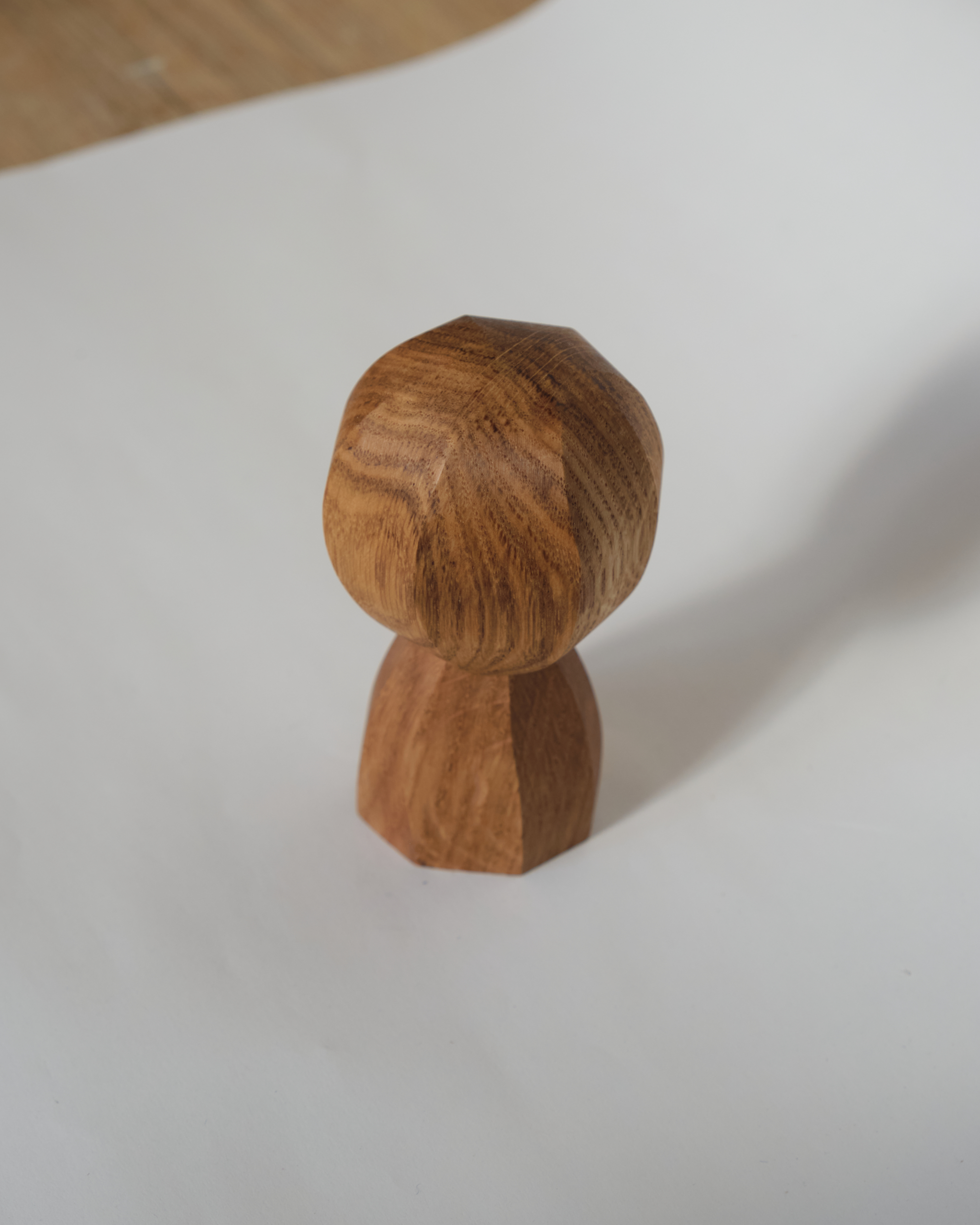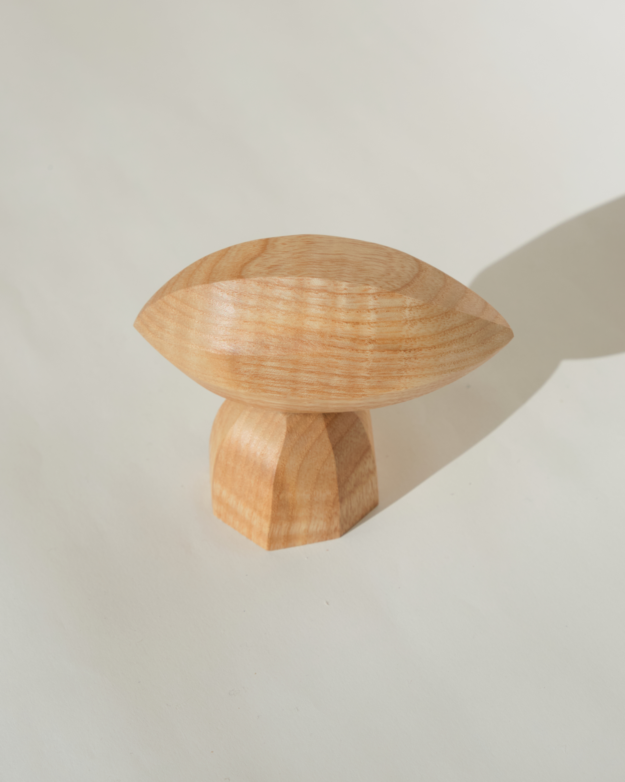 In both uses, the knob and base are carved from solid wood, with the final form shaped directly by hand. The surface is textured and uneven, with deliberate irregularities and visible traces of the carving process left intact. Each piece is one-of-a-kind. Variations in form and surface are part of the design.