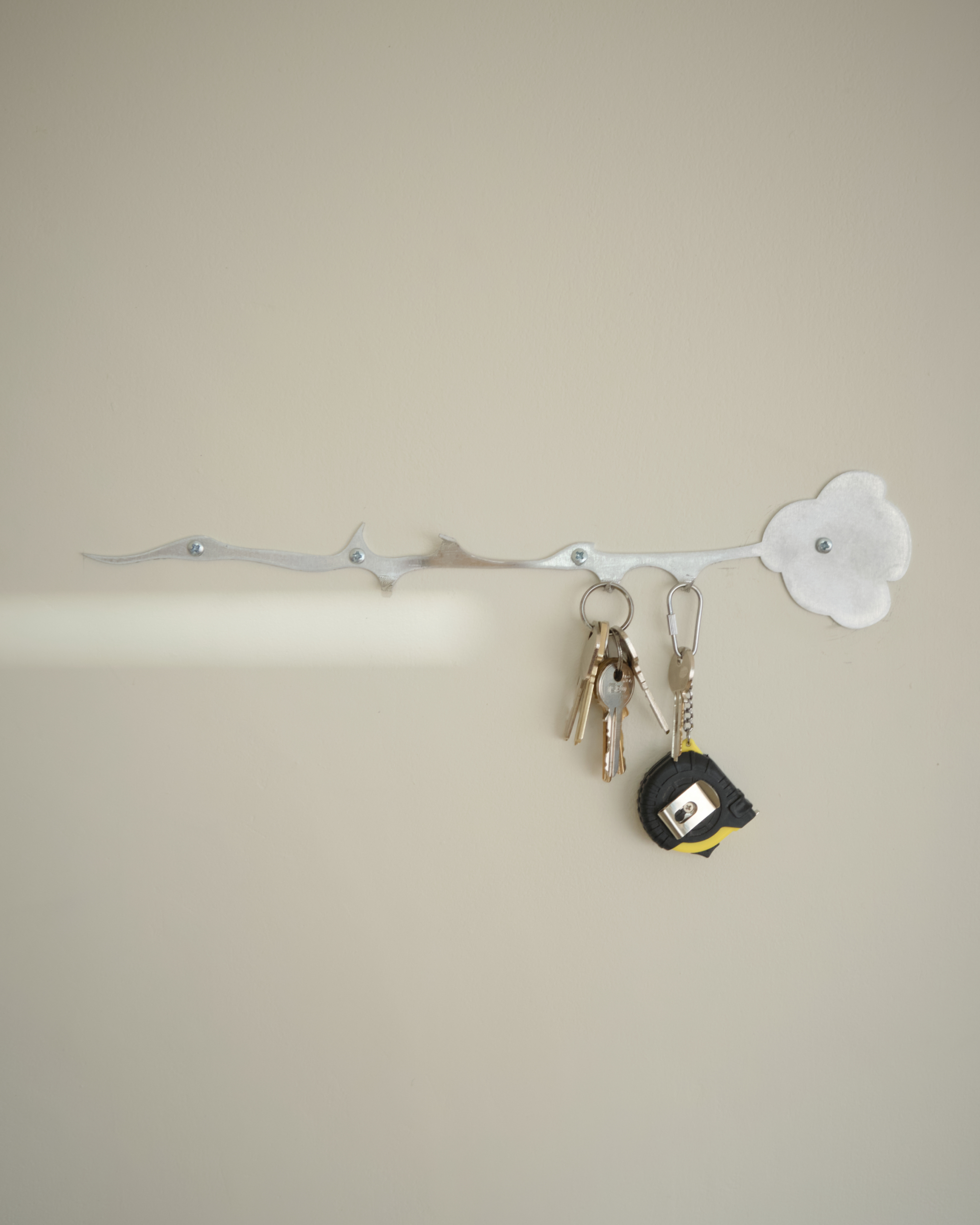 Designed as a lasting alternative to cut flowers, Rosa turns a familiar romantic motif into something practical. Formed from a single piece of sheet aluminium, the material is cut into the outline of a rose, with the flower’s thorns drawn outward to create a series of subtle hooks. The hooks are intentionally small, making Rosa best suited to hanging keys, hats, or other lightweight everyday items.